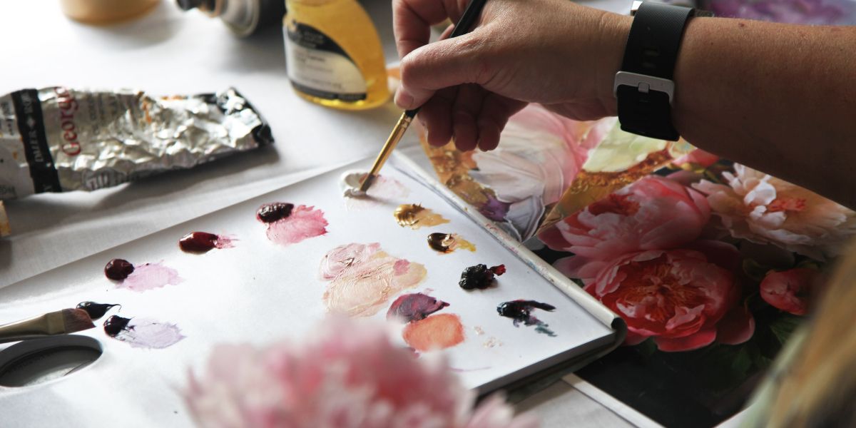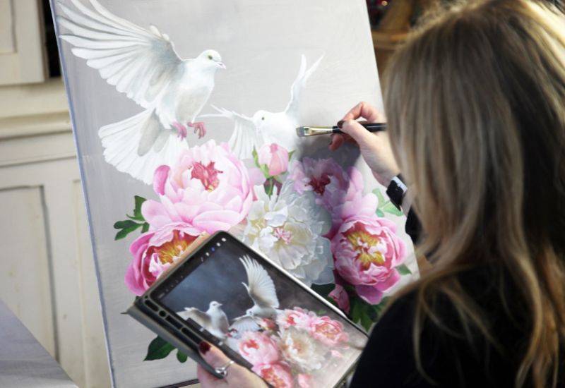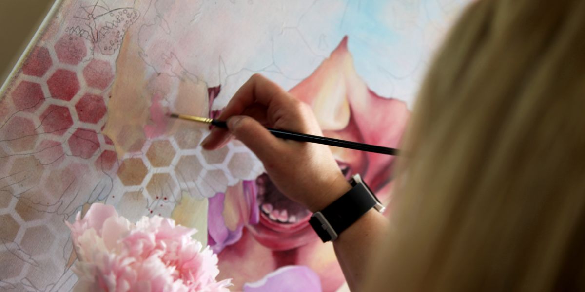 Discover feminine strength and beauty in my original paintings, where mythology meets floral motifs to transform and inspire any space
