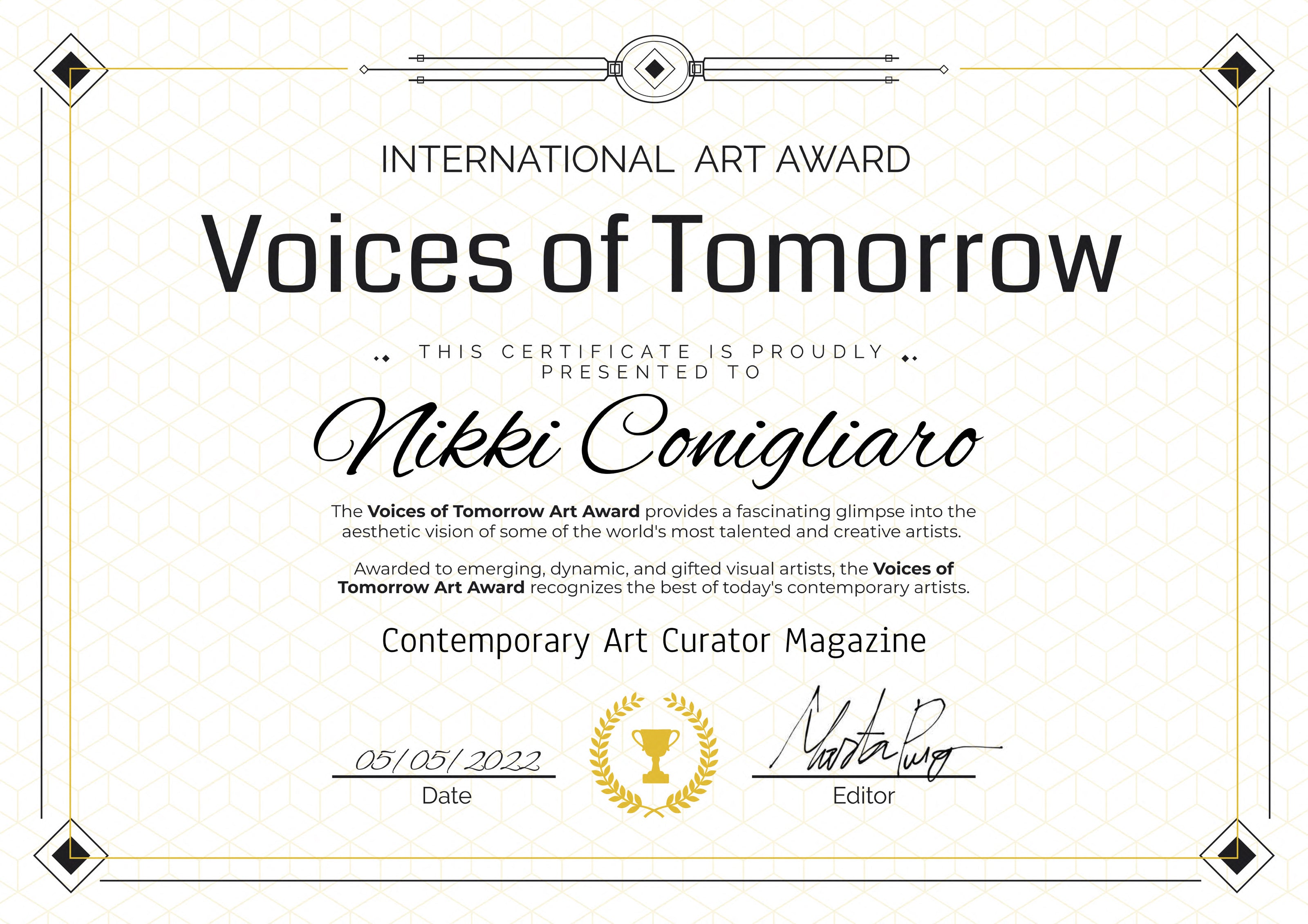 Nikki won the voices of Tomorrow award after exhibiting with Contemporary Art Curator - Butterfly Effect Exhibit
