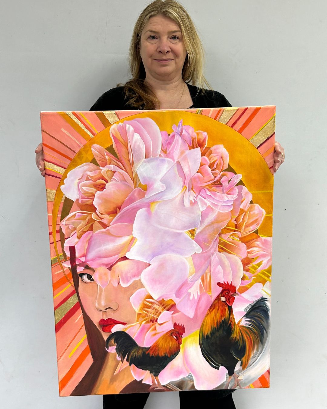 Amaterasu, the Japanese sun goddess, radiates with the warmth of white, gold, and pink roses, accompanied by two roosters and sun rays. A sun disc crowns her, emphasizing her role as the source of light and life. Through my layered process, I’ve infused the painting with vibrant energy, capturing Amaterasu’s divine brilliance and nurturing spirit.