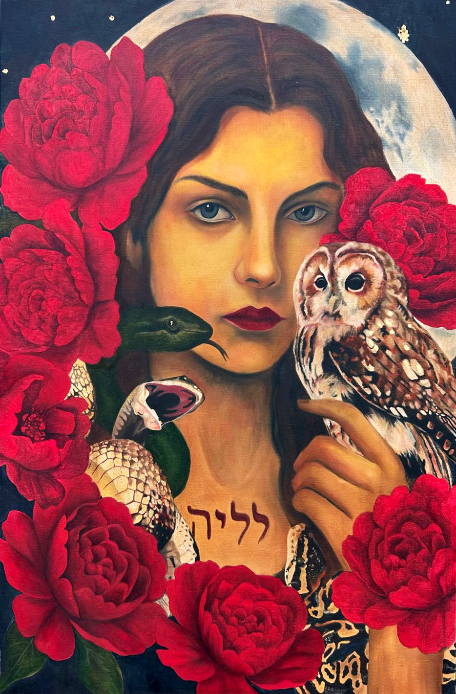 Lilith, the embodiment of unapologetic feminine freedom, is portrayed here as the first woman who chose sovereignty over silence. Her presence radiates raw, magnetic power — soft yet unbound — with gold leaf accents illuminating her fire within. The deep shadows and sensual energy in her expression speak not of rebellion for defiance’s sake, but of sacred self-possession — a woman who belongs only to herself.