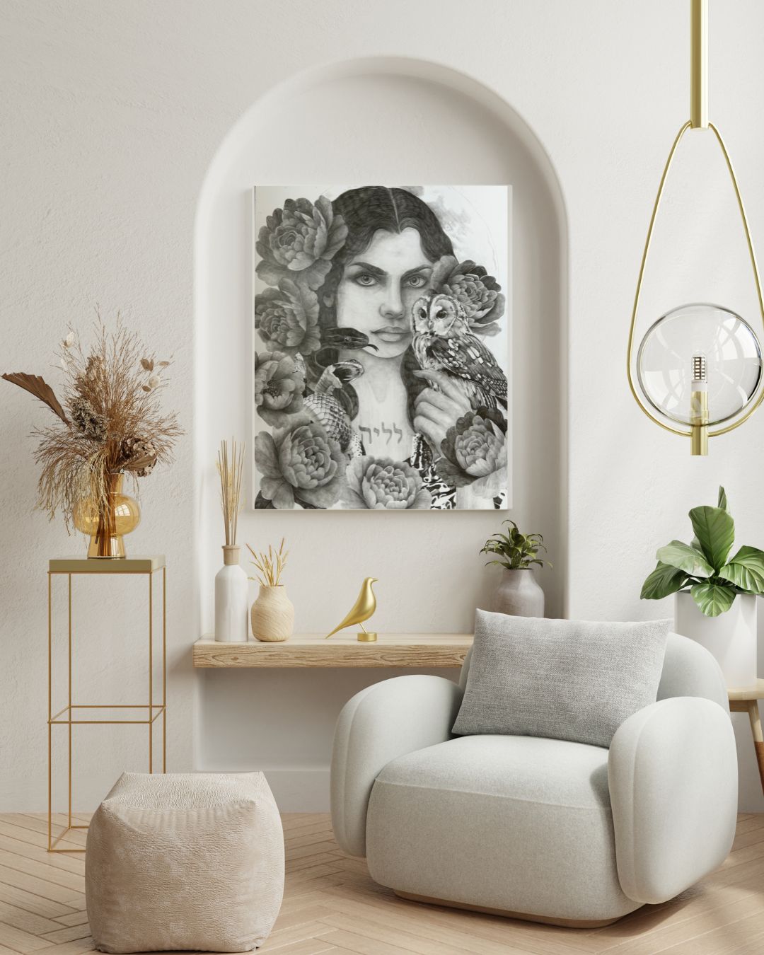 Step into the raw, untamed power of ‘Lilith’ — the first woman, the rebel, the archetype of radical feminine freedom. Feared by myth, but honoured today as the voice of self-sovereignty, she represents desire without apology and power unclaimed by patriarchy. In this graphite portrayal, Lilith is both shadow and flame — mesmerising, magnetic, and fiercely alive. Each print is a giclée masterpiece, created exclusively for you on 310gsm Hahnemühle German Etch paper, celebrated for its luxurious texture and archival longevity. The pigment-based inks ensure true depth and permanence — a statement piece for those who choose truth over obedience.