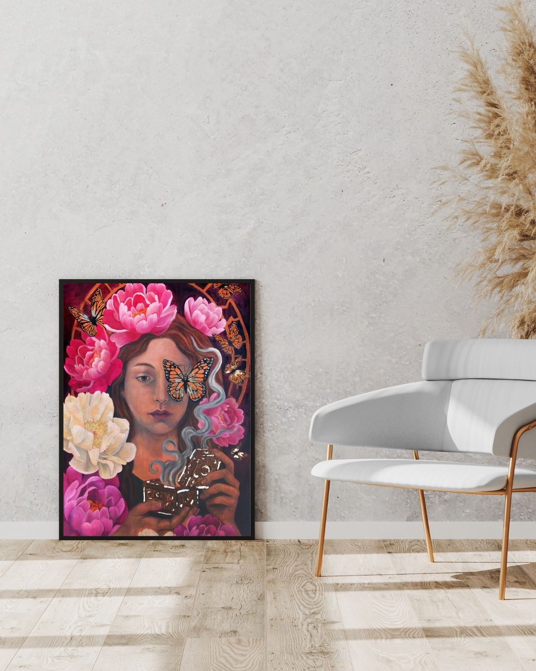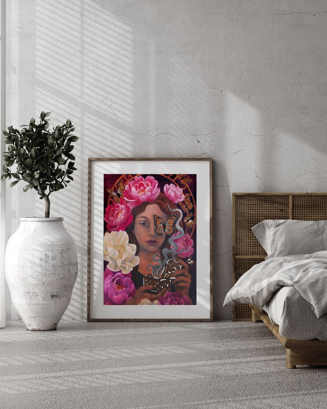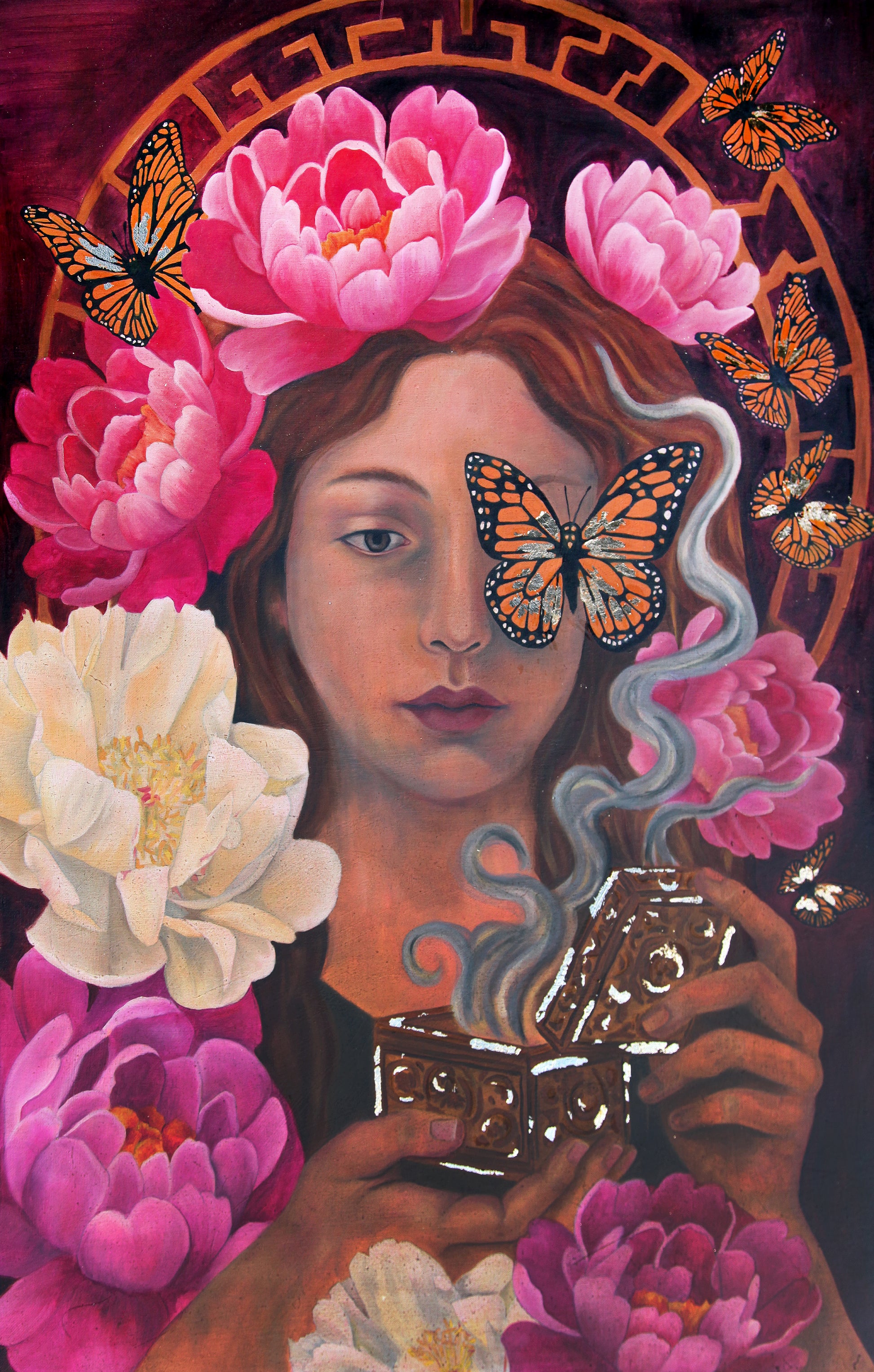 Pandora, often misunderstood in myth, is reimagined here as the bearer of awakening rather than chaos. Painted in a moment of quiet realisation, she holds the threshold between innocence and wisdom, with gold leaf softly illuminating the hope that remained within her story. Her presence speaks to the courage of opening what is hidden — not to destroy, but to reveal the truth of the soul.