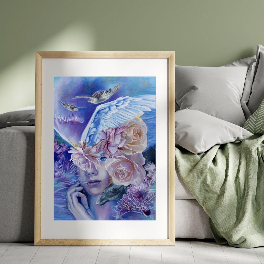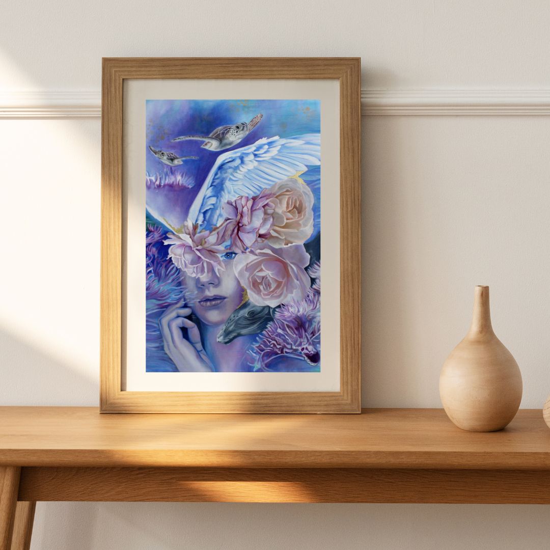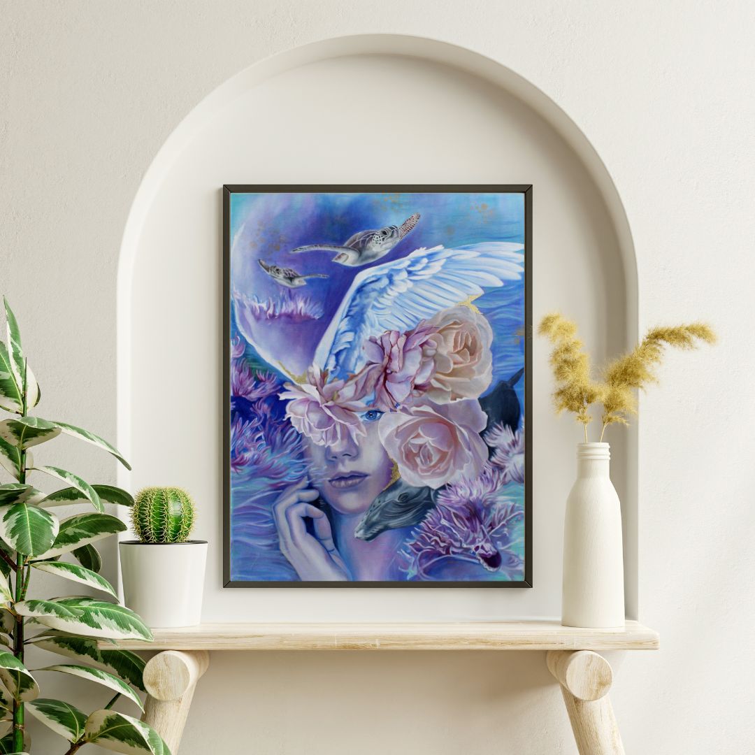 Experience 'Sedna'—the Inuit goddess of the sea and marine animals, portrayed in this powerful print that explores her story of transformation and resilience. Crafted on 310gsm Hahnemühle German Etch paper with archival inks, the artwork captures the depth and fluidity of the ocean, making Sedna’s tale endure as vividly as the tides.