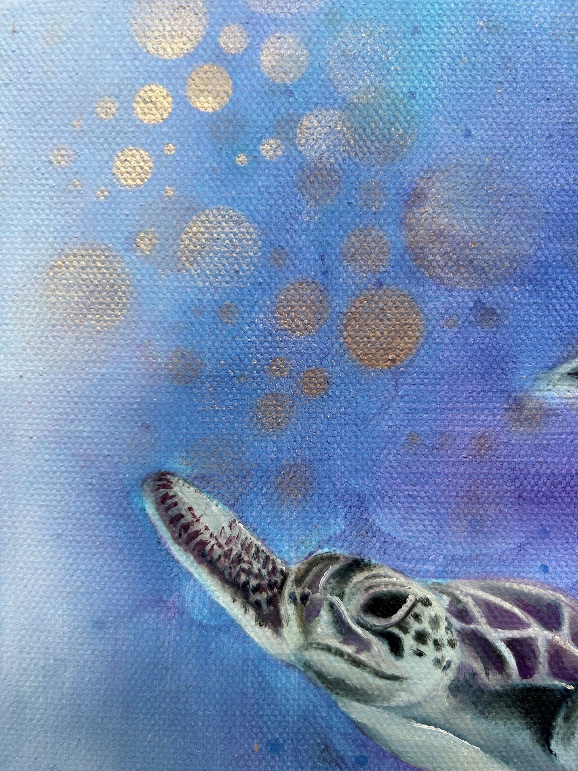 Sedna, the Inuit sea goddess, is surrounded by ocean blues, graceful turtles, and majestic whales, all anchored by vibrant coral. Roses intertwine, symbolizing her beauty and deep connection to the sea's mysteries. My creative process layers rich textures and fluid colours, evoking Sedna’s powerful yet nurturing presence within the vast, untamed ocean.