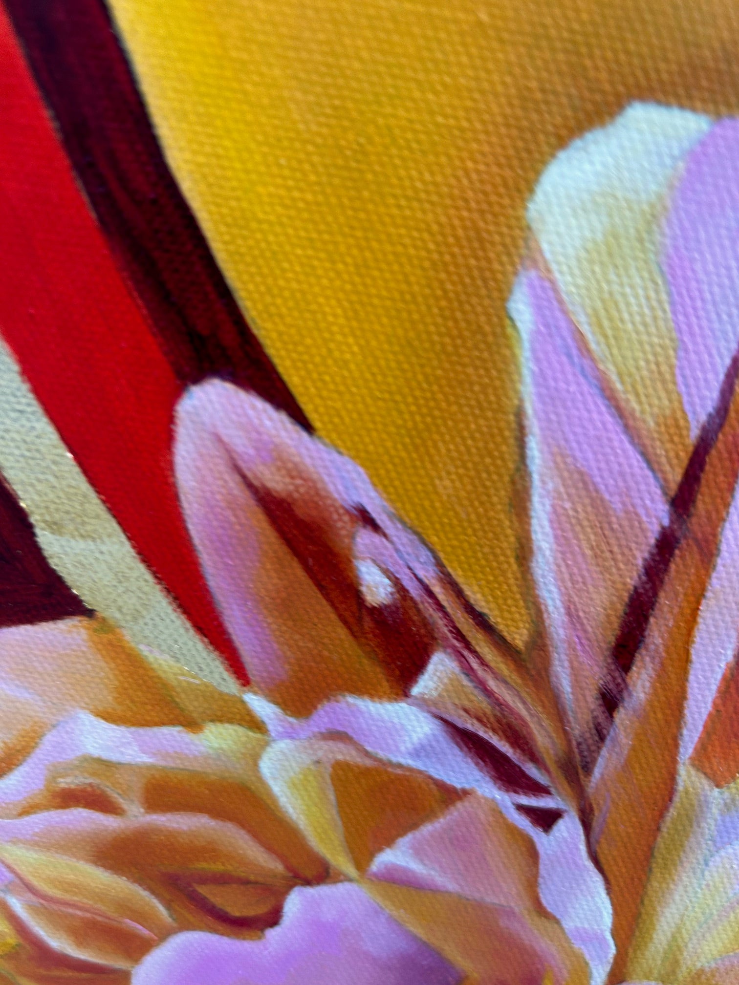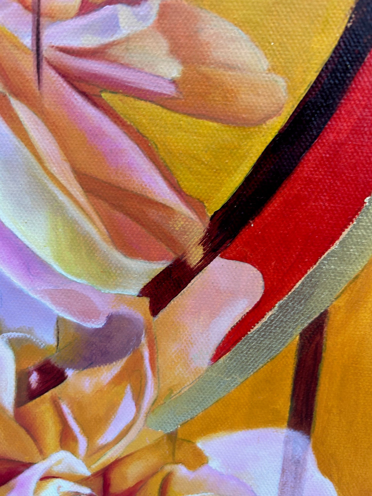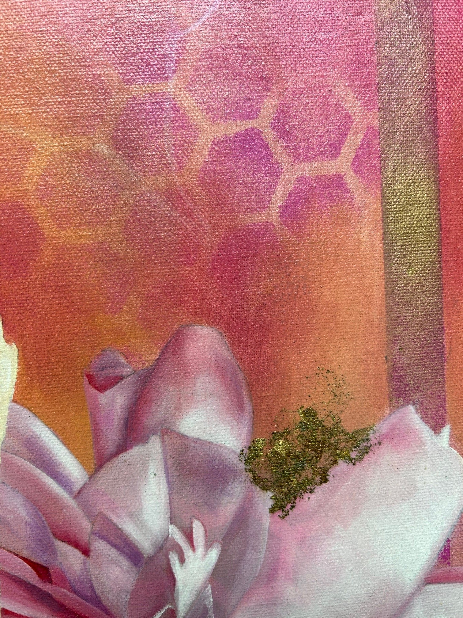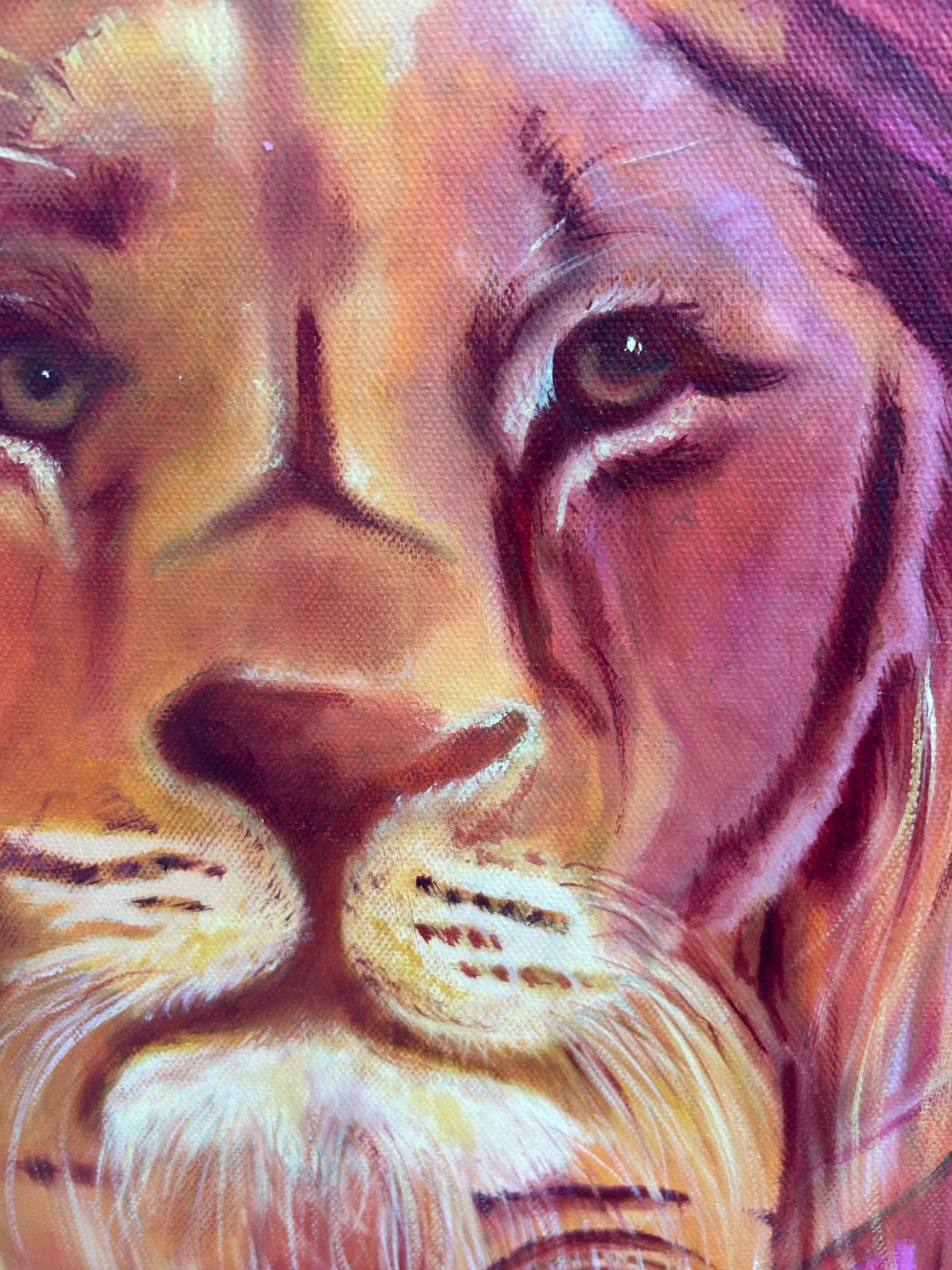 Sekhmet, the fierce Egyptian goddess of war and healing, is portrayed with a lioness head, encircled by a cobra in a golden ring symbolizing the sun. Pink and gold roses add a touch of feminine beauty to her powerful presence. My art process combines vibrant colours with rich textures, capturing Sekhmet’s dual nature of destruction and healing.