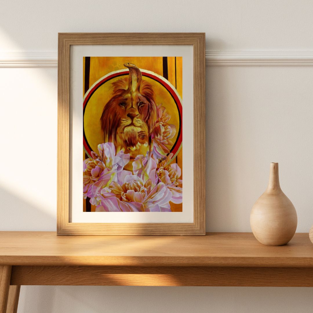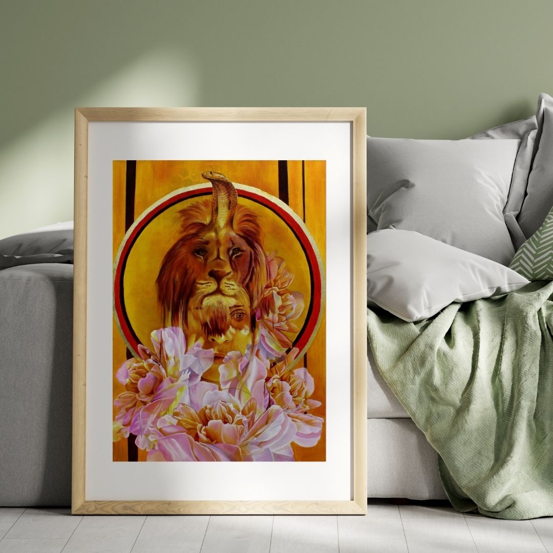 Embrace the fierce and majestic 'Sekhmet'—a portrayal of the ancient Egyptian goddess of war and healing. This compelling print captures Sekhmet's dual nature, illustrating her power to both create and destroy, a symbol of strength and regeneration. Each giclée print is meticulously produced on 310gsm Hahnemühle German Etch paper, ensuring a presentation that is as durable as it is exquisite. The archival pigment-based inks highlight the vibrant hues and intricate details, promising a visual experience that will last a lifetime. Let 'Sekhmet' stand as a guardian of your space, embodying courage and transformation.