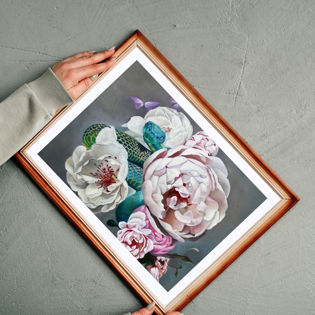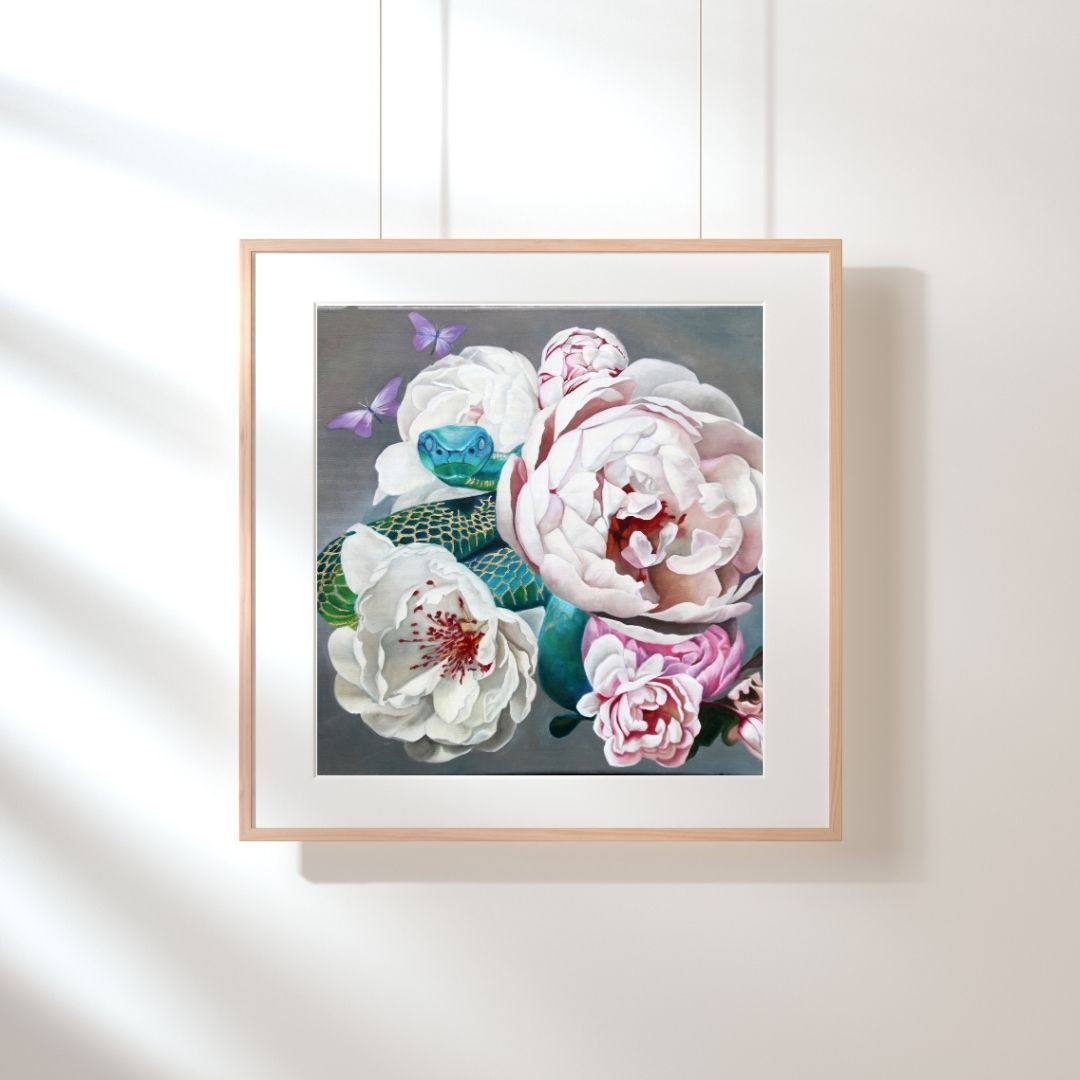 The Snake, entwined with roses and peonies, symbolizes transformation, resilience, and rebirth. Known for its ability to shed its skin, the snake invites you to embrace change and personal growth. This painting celebrates the power of renewal and the beauty of transformation.
