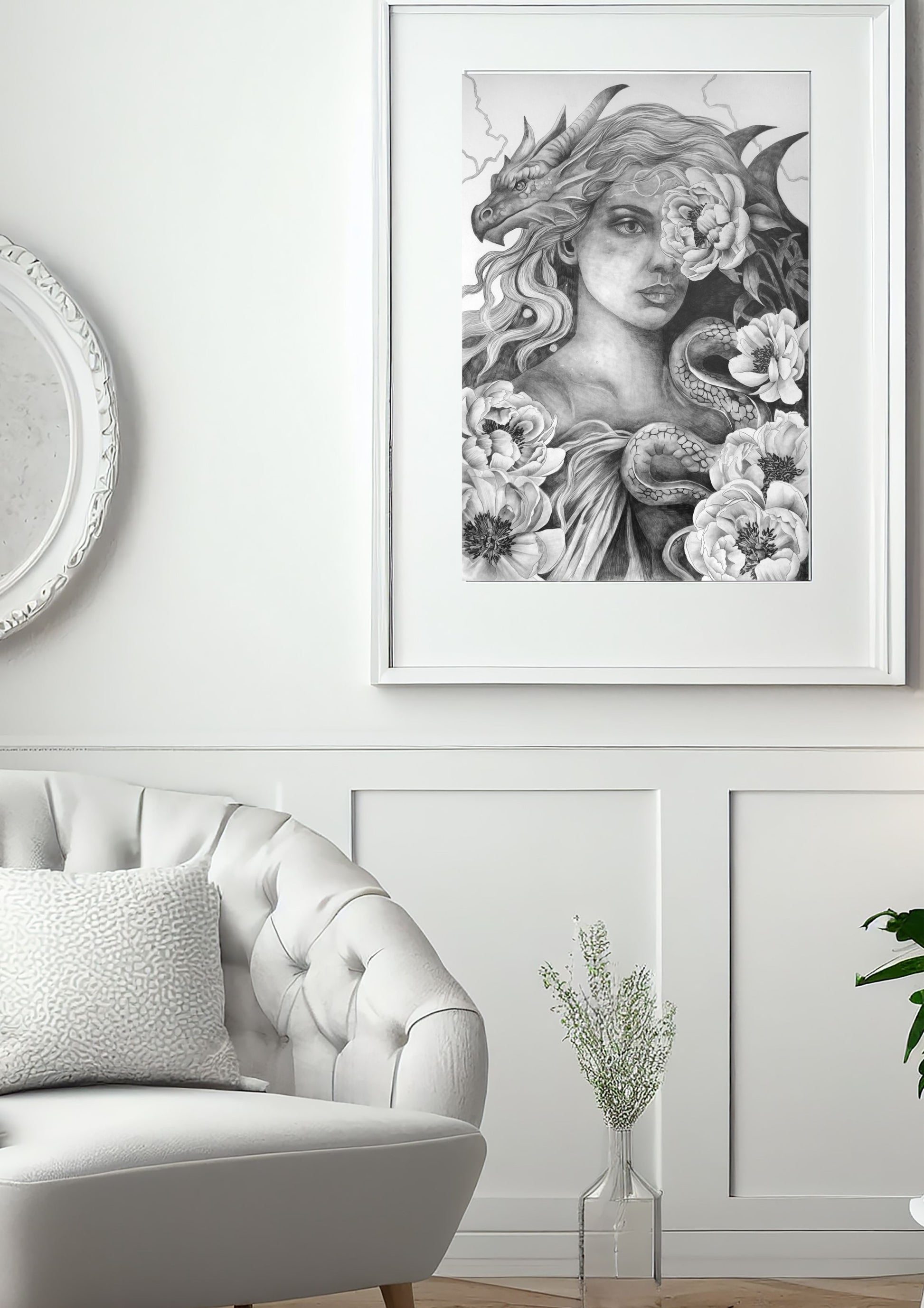 Behold the primordial force of ‘Tiamat’ — the ancient mother of creation and chaos, born from saltwater and starlight. She is the origin of life itself, a cosmic serpent of oceans and galaxies, both fierce and deeply sacred. This graphite portrayal honours her vastness — not as a monster, but as the original source, the power before order, the sacred wild that births new worlds from destruction. Each print is a giclée masterpiece, created exclusively for you on 310gsm Hahnemühle German Etch paper, celebrated for its luxurious texture and archival longevity. The pigment-based inks ensure true depth and permanence — a powerful centrepiece for those who honour the raw origins of feminine divinity.